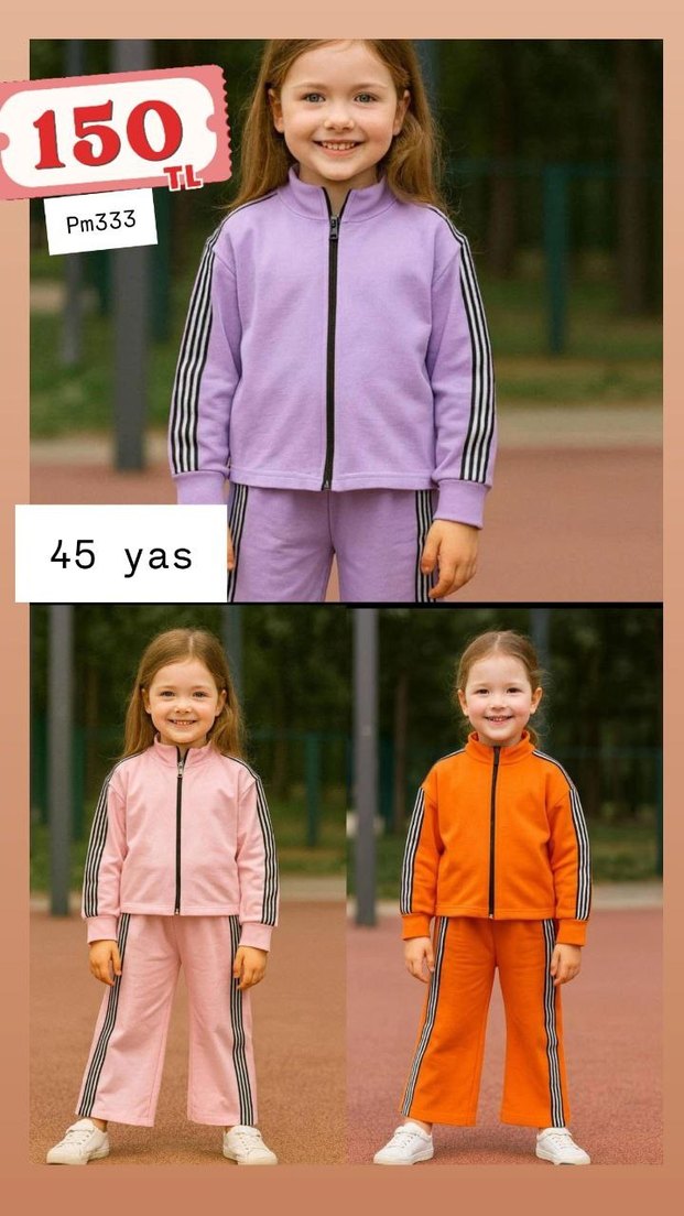 Mor pastel renkte, fermuarlı, uzun kollu kız çocuk eşofman takımı. Yumuşak ve sıcak kumaştan, dar kesim, kol ve pantolonda çizgili detaylarla.