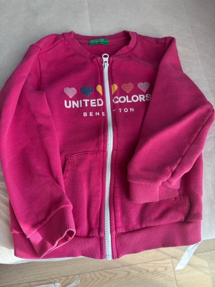 Kız çocukları için fermuarlı, pembe, yumuşak kumaştan üretilmiş, fitted kesim sweatshirt. Üzerinde renkli kalp detayları ve UNITED COLORS BENE yazısı bulunur.