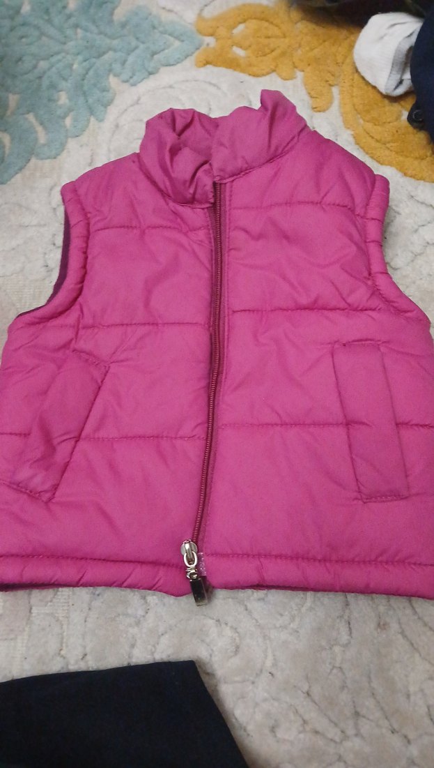 Fermuarlı, yakalı, kolsuz pembe yelek. İnce ve sıcak tutan kumaştan, vücuda oturan kesimde.