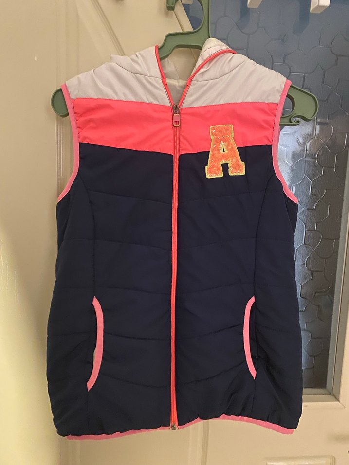 Fermuarlı, dar kesim kız çocuk yeleği. Pembe, lacivert ve açık gri renk bloklu, göğüste baskılı 'A' harfi bulunur. Sokak stiline uygun. 10-12 yas icin ideal.