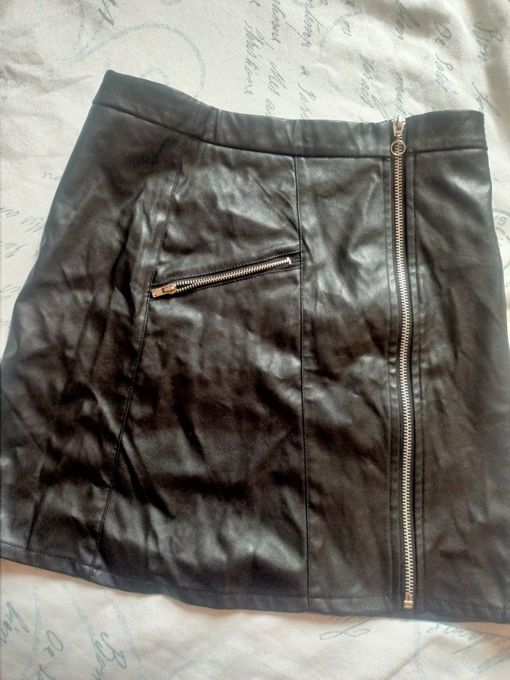 Parlak siyah deri, fermuarlı detaylara sahip, vücuda oturan mini etek. 9 10 yaş için uygun
