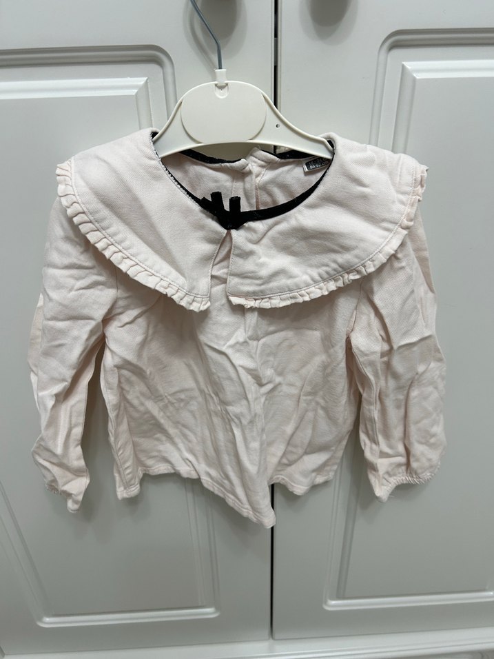 Kız çocukları için keten kumaştan yapılmış, beyaz renkli, yakası fırfırlı ve uzun kollu, salaş kesim bluz. Pastel sokak stiliyle uyumludur.