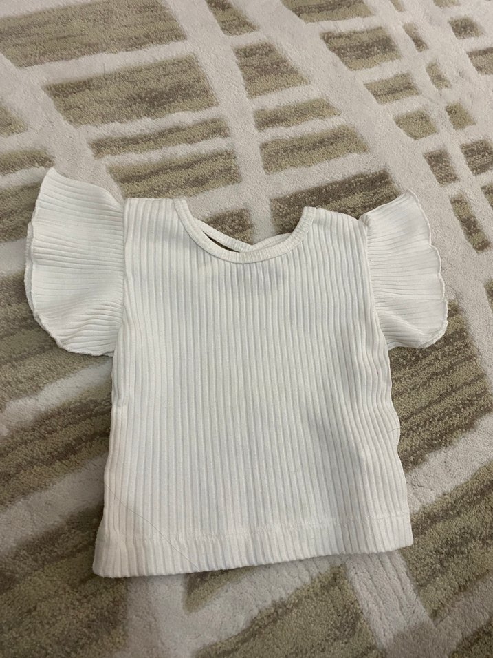 Kısa fırfırlı kollara ve yuvarlak yaka sahip, beyaz renkli, yumuşak triko kumaştan yapılmış kız çocuk bluzu. Sade ve desensiz, temel stil için uygundur.