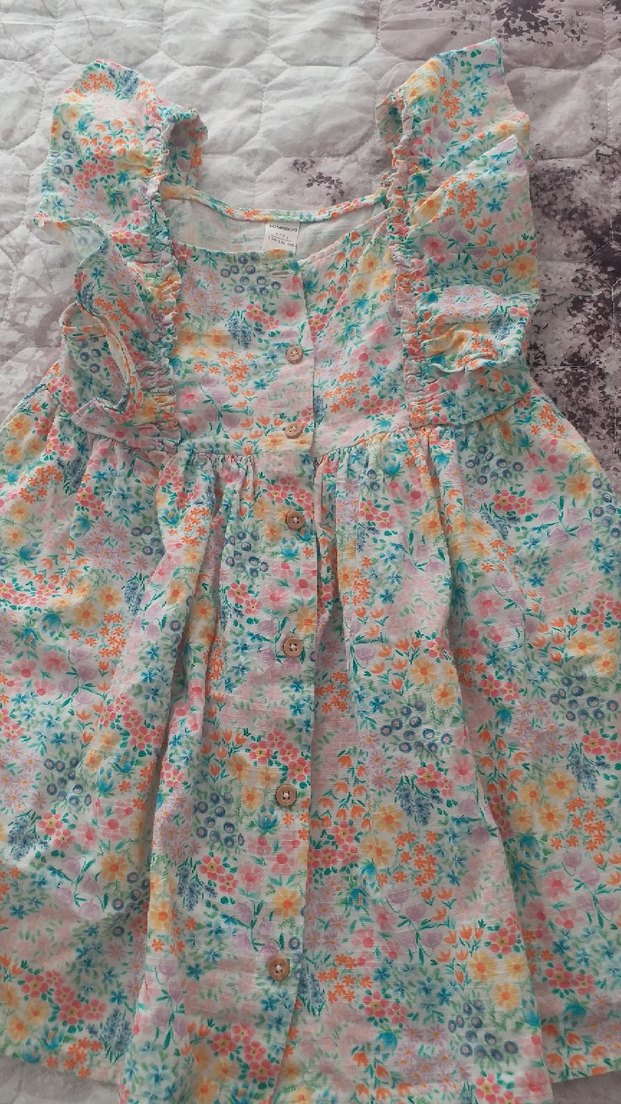 Yumuşak sentetik kumaştan, düğmeli, fırfırlı ve pastel çiçek desenli, kolsuz bol kesim bohem tarz kız çocuk elbisesi.