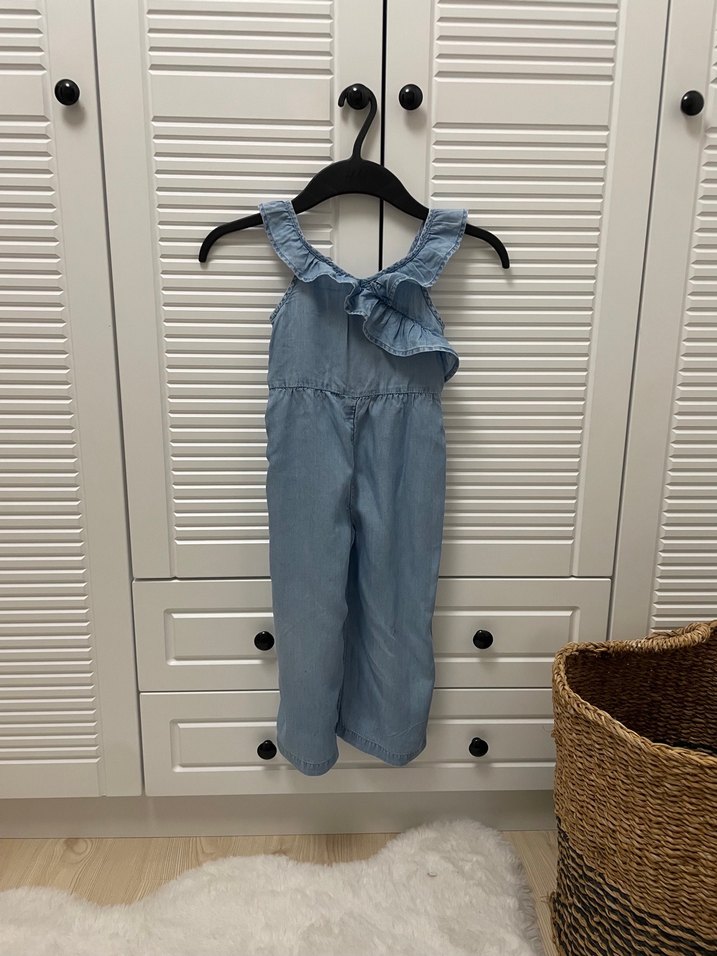 Kız çocuklar için fitted kesim, kolsuz denim tulum, ön kısmında fırfır detayı ile sade ve şık bir görünüm sunar.