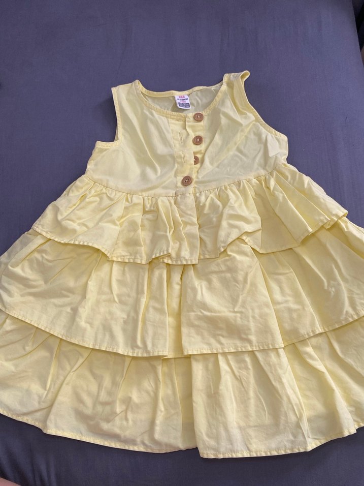 Kız çocuk fırfırlı elbise sarı renkte düğme detayları var hiçbir sorunu yok birkaç kez kullanıldı defosu yok