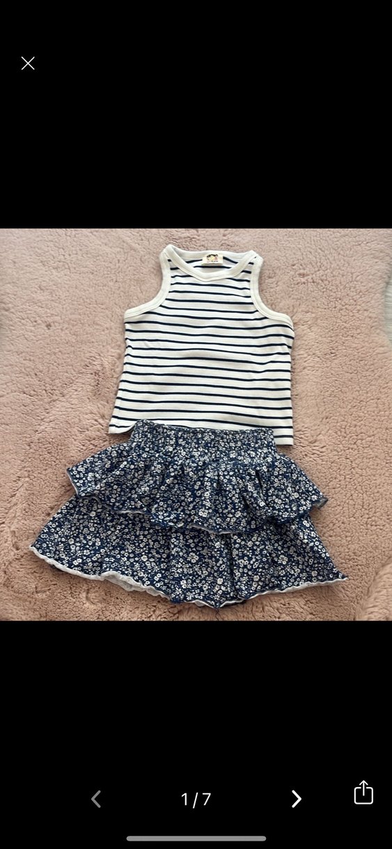 Kolsuz çizgili üst ve koyu mavi çiçekli fırfırlı etekten oluşan kız çocuk takımı. Rahat ve şık günlük kullanıma uygun. Etek 6 yaş üst 7.8 yaş