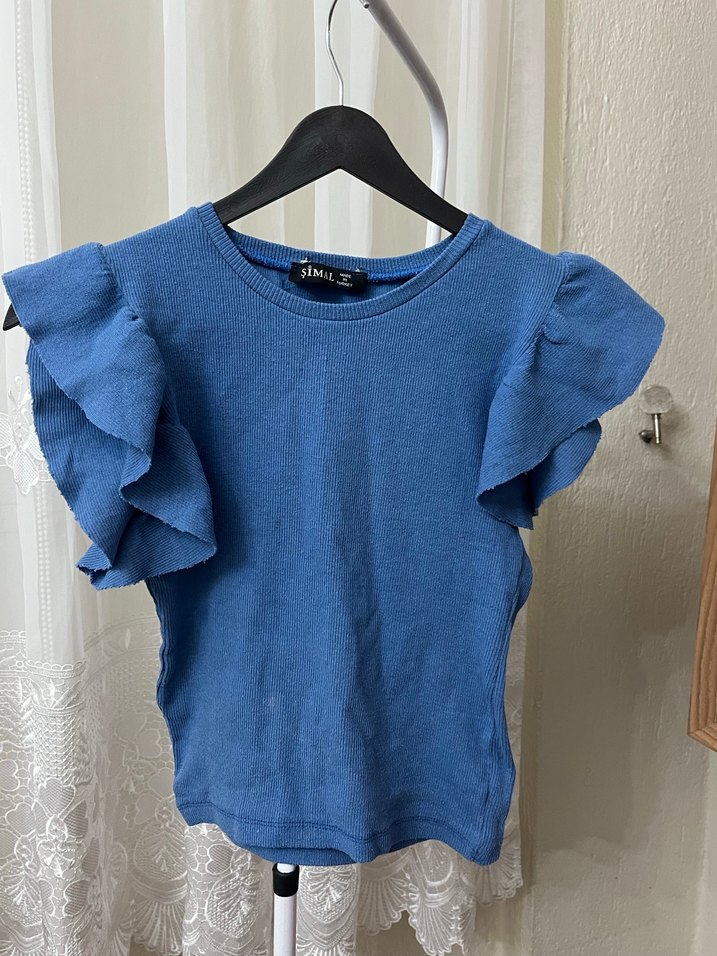 Parlak mavi denim kumaştan, kısa fırfırlı kollu ve yuvarlak yakalı, dar kesim kız çocuk tişörtü.