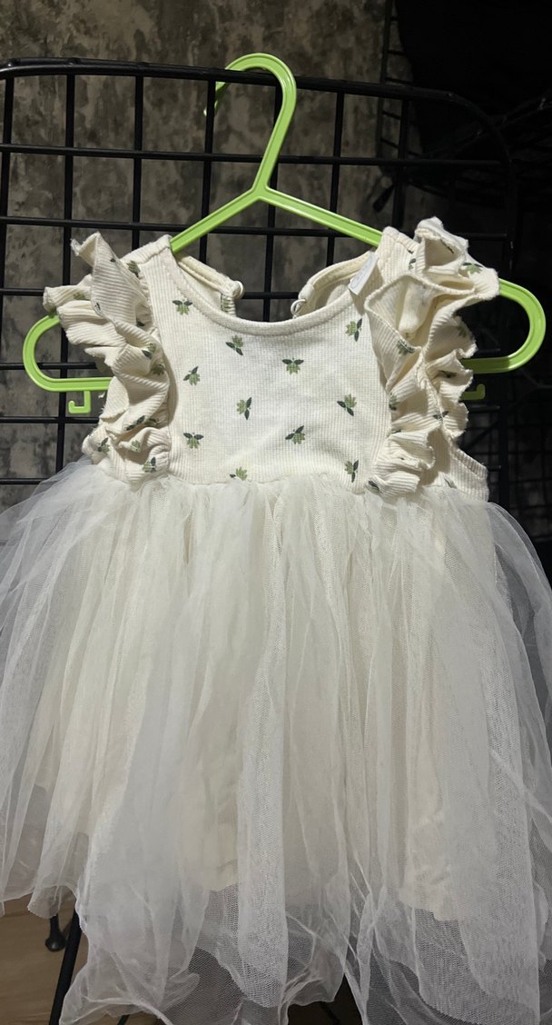 Pamuklu, fırfırlı ve nakışlı çiçek desenli, kolsuz, straplez, ince ve hafif etekli, şık kesimli kız çocuk elbisesi.