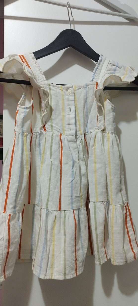 Kız çocuk elbise, pamuklu kumaştan, askısız ve fırfırlı detaylıdır. Bohem tarzda, hafif çizgili ve bol kesimdir.