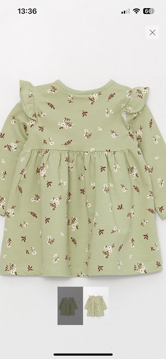 Kız çocuk elbise, uzun kollu ve yuvarlak yakalıdır. Pamuklu yumuşak kumaştan, pastel haki renk ve çiçek desenlidir. Fırfır detayları bohem tarzı yansıtır.