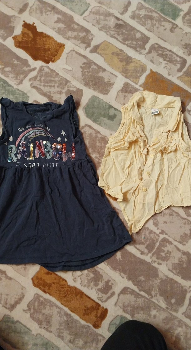 Kız çocukları için bol kesim, kolsuz pamuklu bluzlar. Fırfır detaylı, biri renkli gökkuşağı baskılı, diğeri düz açık renkli, bohem tarzda.