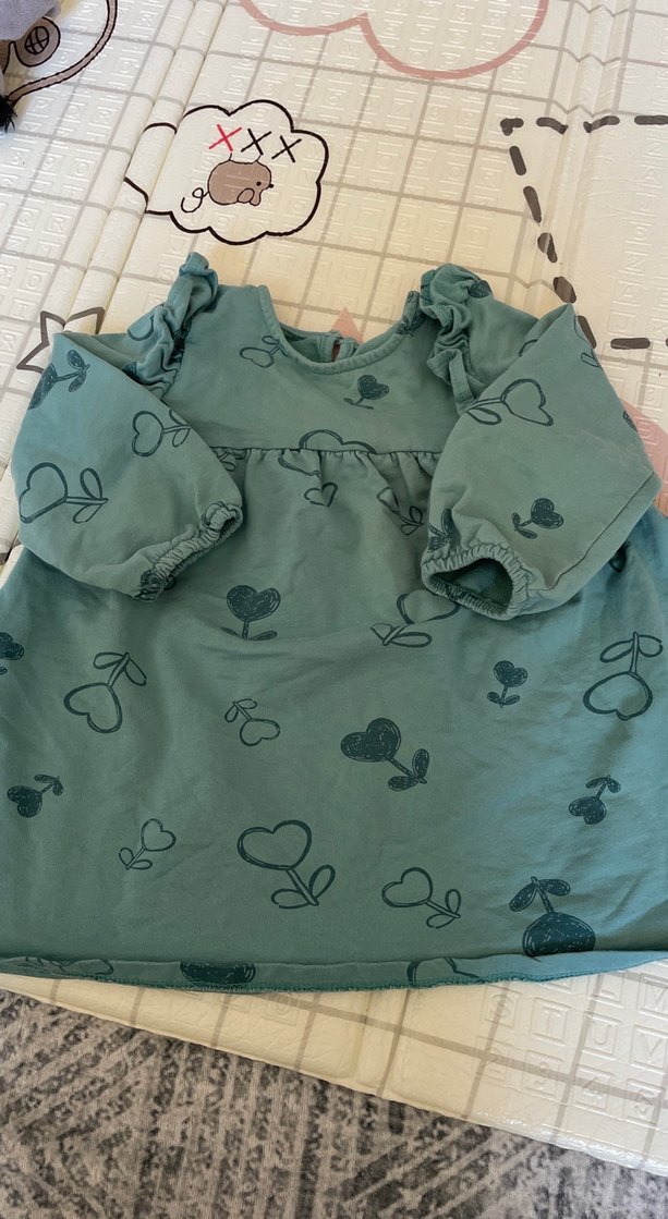 Koyu yeşil renkte kız çocuk elbisesi, uzun kollu ve yuvarlak yakalıdır. Yumuşak kumaştan olup, baskılı deseni ve omuzlarda fırfır detayları vardır. Kullanılmış üründür 3/4 yaş yazıyor etikette