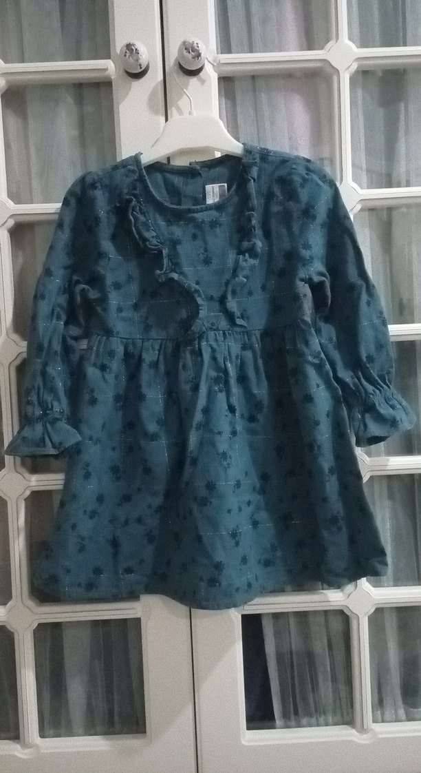 Bol kesim koyu mavi kot elbise, uzun kollu, V yaka ve fırfır detaylıdır. Hafif batik desenli dokusu vardır.