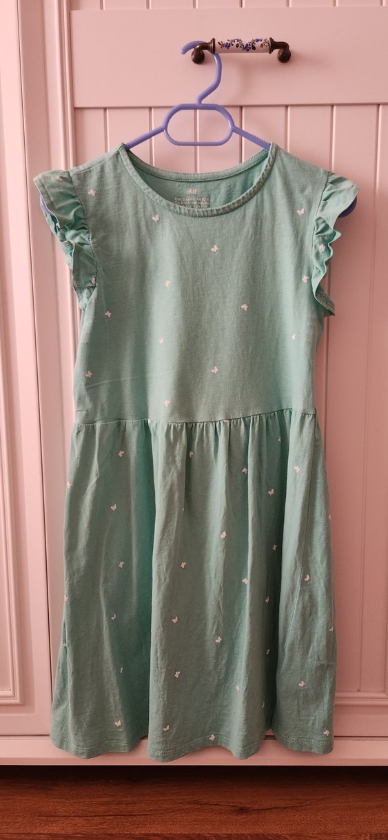 Pamuk kumaştan, minik kelebek baskı desenli, fırfırlı kısa kollu ve bol kesim yeşil kız çocuk elbisesi. Rahat bir günlük şıklık sunar.