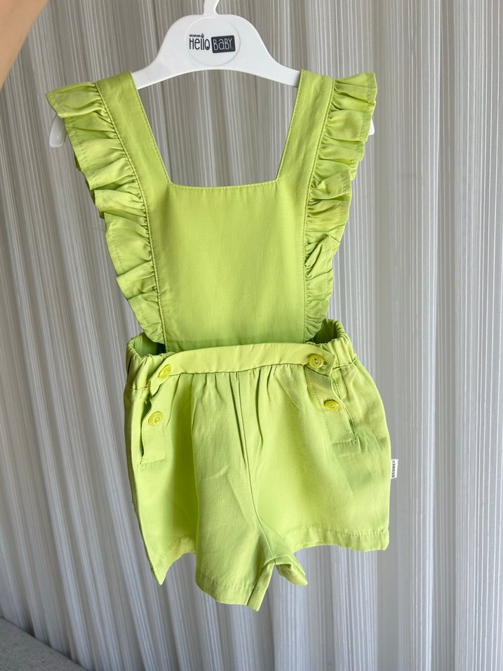 Kız çocukları için yeşil , fırfırlı askılı ve regular fit salopet. Düğme detayları ve nefes alabilen yumuşak kumaş içerir. E-bebek markalı. Beden tam 6 aylıktır.