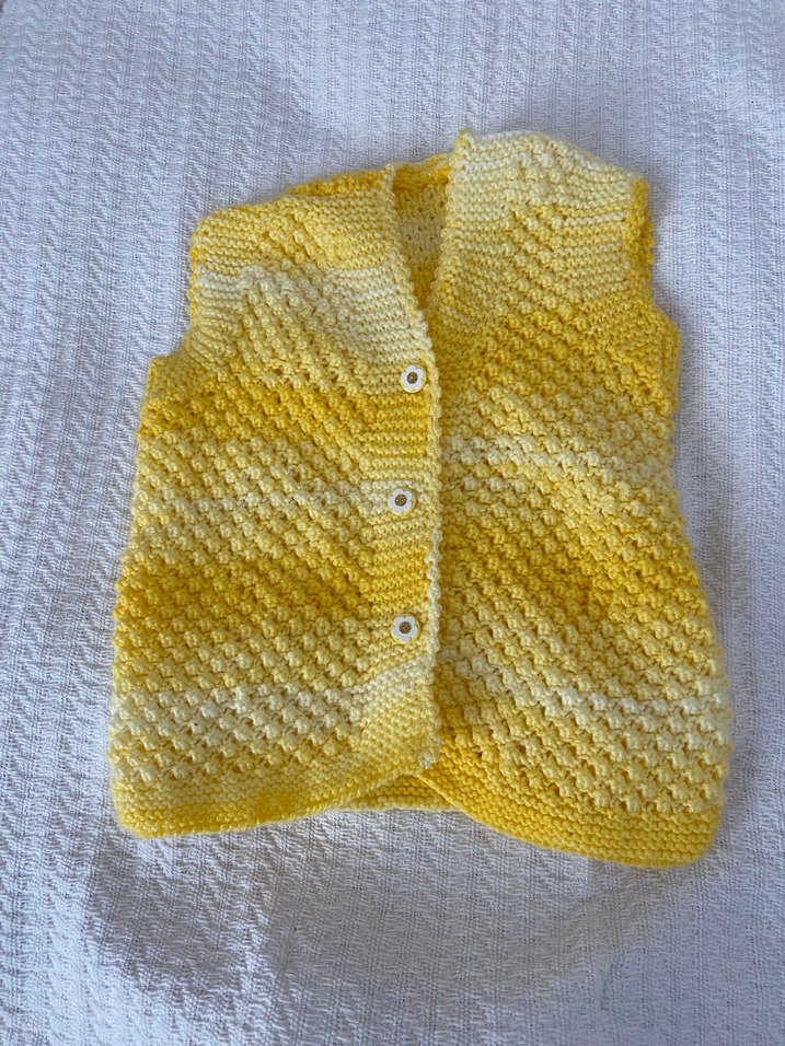 Kız çocuklar için pastel sarı renkte, fıstık örgü desenli, düğmeli, bohem tarzda, dar kesim kolsuz yelek. Ölçüler fotoğrafta mevcut