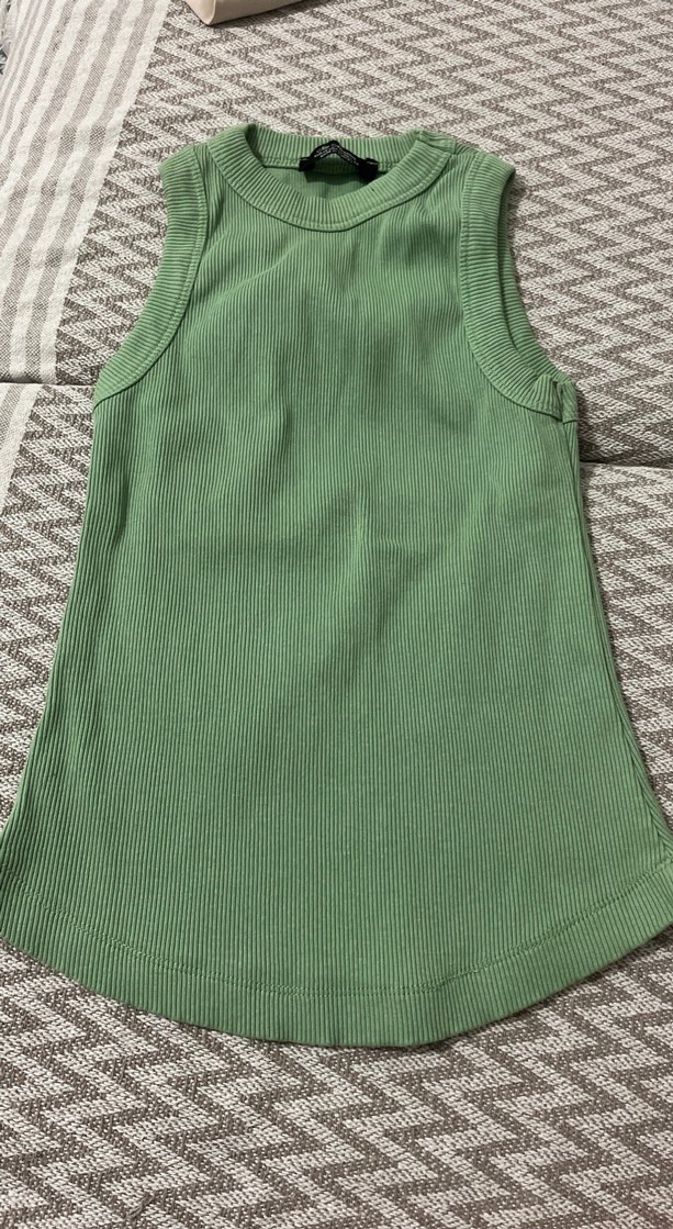 Yüksek yakalı, kolsuz ve fit kesim kız çocuk yelek. Yumuşak sentetik kumaştan, yeşil renkte ve triko dokulu.