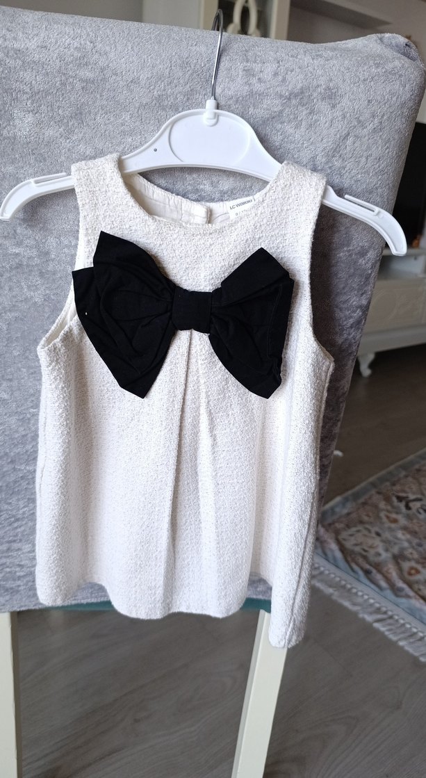 Kolsuz, kruvaze yakalı, önünde büyük siyah fiyonk bulunan beyaz kız çocuk elbisesi. Yumuşak sentetik kumaştan, şık streetwear tarzında. Kızıma artık küçük geliyor 3 kere giydi hiç biyerinde lekesi yoktur