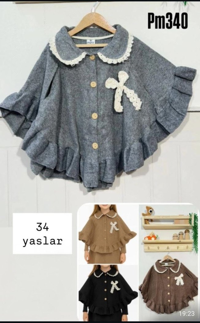 Füme renk, uzun kollu, volanlı ve nakış detaylı triko panço. Geniş kesim, 34 yaş kız çocukları için uygun.