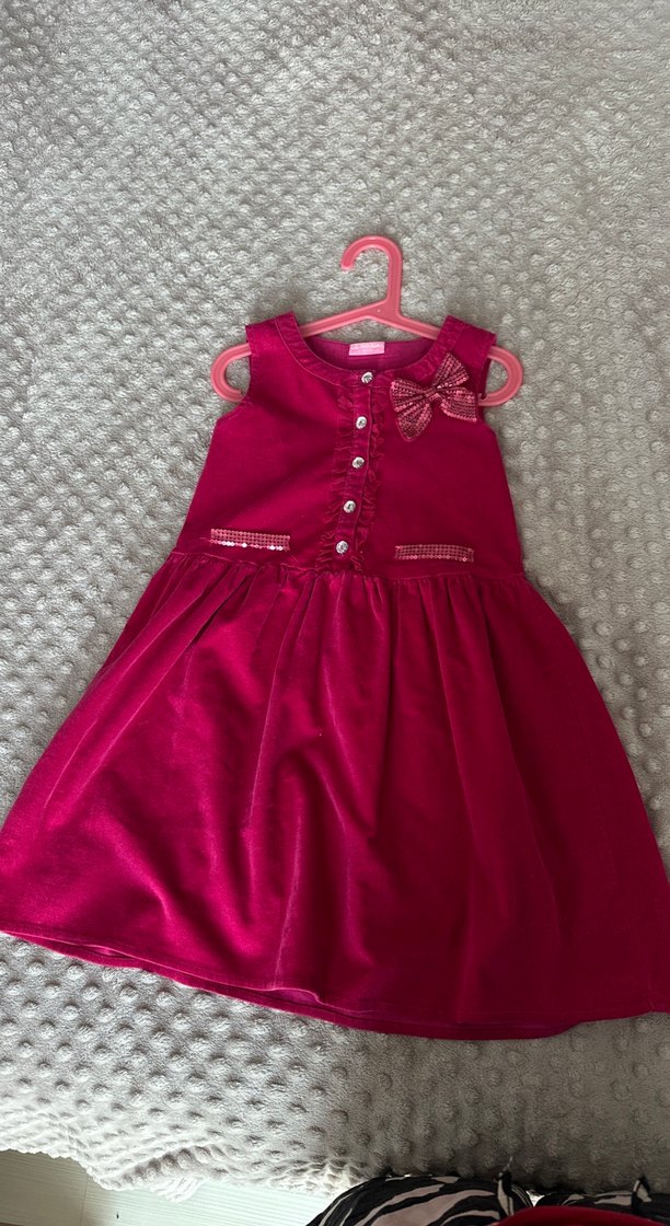 Kız çocuk elbisesi, düğme detaylı ve fiyonk aksanlı kolsuz modeldir. Rahat kesimli ve canlı fuşya renkte, yumuşak sentetik kumaştan üretilmiştir.