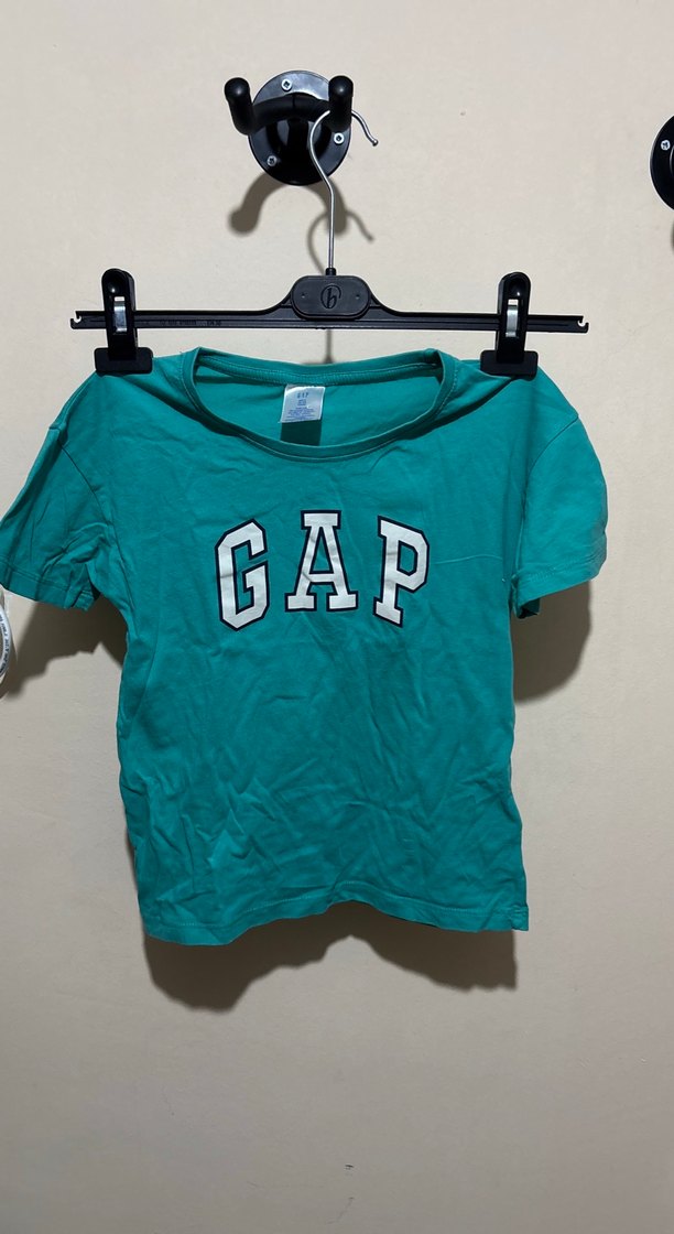 Koyu yeşil renkli, kısa kollu ve yuvarlak yaka kız çocuk tişörtü, GAP baskılı ve trend sokak tarzına uygun dar kesim.