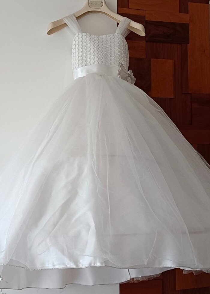 7-8 yaş (128cm) kız çocuğu için gelinlik. 1kere giyilmistir, herhangi bir hasarı yoktur.