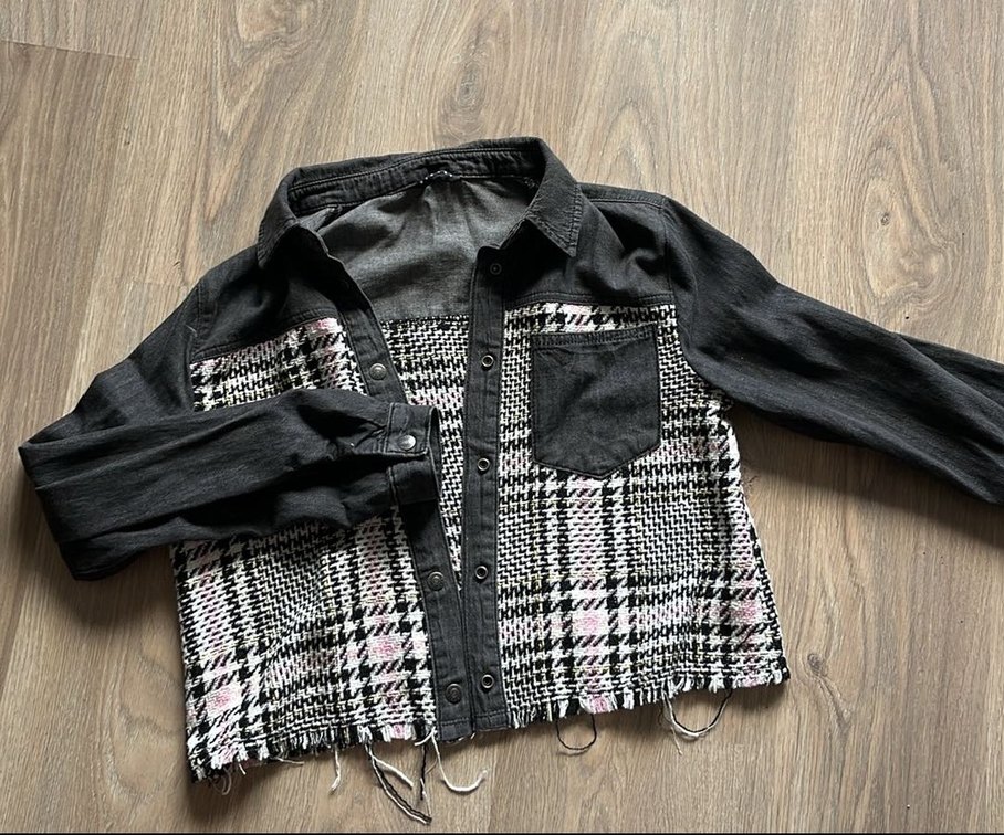 Düğmeli, bol kesim gömlek, kazayağı desenli ve düz siyah kumaşın birleşimiyle dikkat çekiyor. Uzun kollu ve kısa boyda. Az ve temiz kullanılmış olup hiç bir sorunu defosu yoktur. Altındaki sarkan ipler modeli gereği öyledir defo değildir