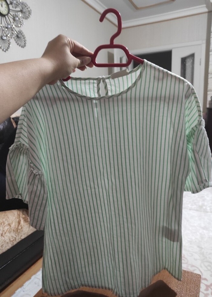 Kolları volanlı bluz. Neredeyse sıfır ayarında, çok az ve çok temiz kullanılmıştır. Herhangi bir yerinde bir kusur yoktur. Beden: 12-13 yaş Boy: 152-156 cm