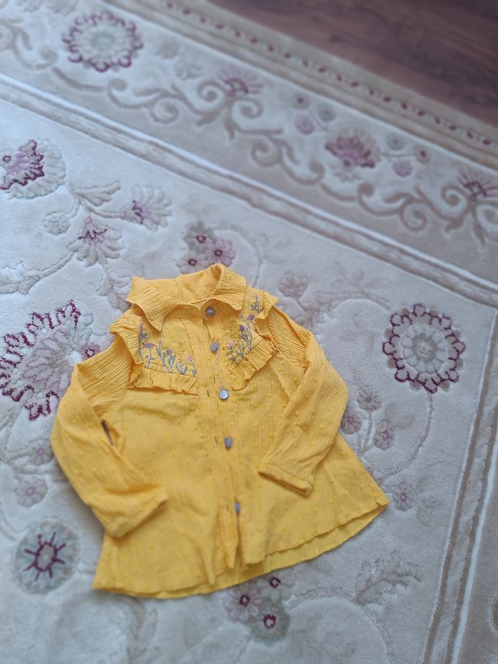 Sarı keten kumaştan, uzun kollu, düğmeli, yakalı ve nakışlı bohem tarzı kız çocuk gömleği.