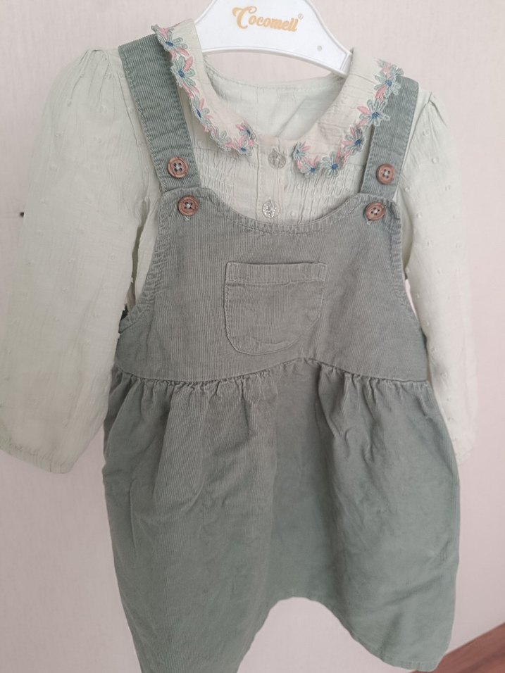 Keten kumaştan, düğmeli ve yakalı, salaş kesim kız çocuk elbisesi. Kolsuz ve desensiz tasarıma sahiptir.