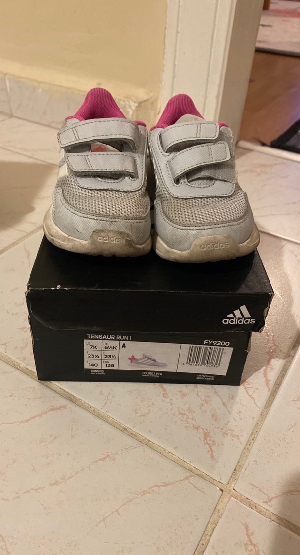 Gri renkli Adidas kız çocuk spor ayakkabısı, baskılı desen ve kolay kullanım için cırt cırtlı bantlara sahiptir. Kauçuk tabanlıdır, trend sokak stili için uygundur.