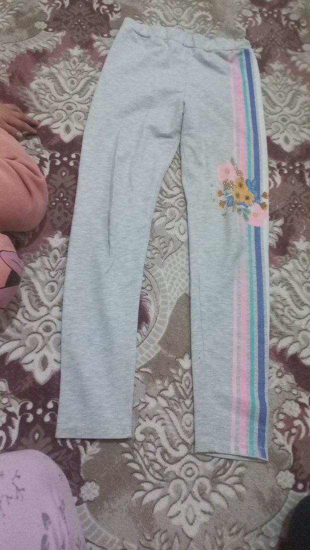 Gri renk, elastik bel bantlı, bol kesim tayt. Bir bacakta renkli şeritler ve çiçek desenleri bulunur. Yumuşak sentetik kumaştan üretilmiştir.
