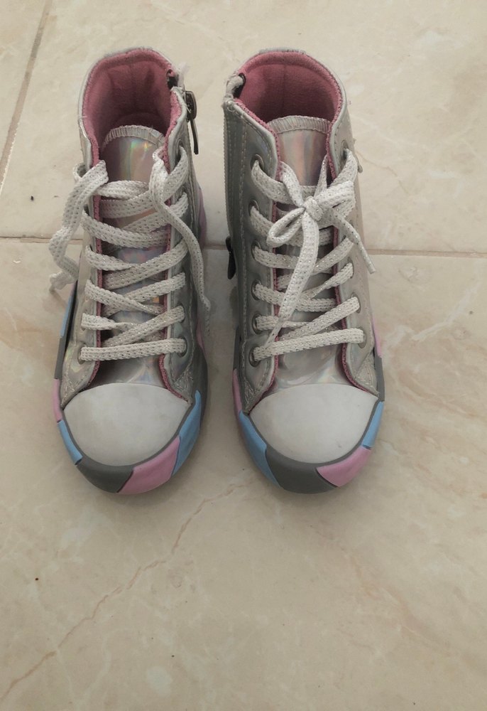 Gri bağcıklı kız çocuk spor ayakkabısı, çok renkli tie-dye desenli ve kauçuk tabanlı, trend sokak stili için uygun. Küçüldüğü şçin satışda sorunsuzdur