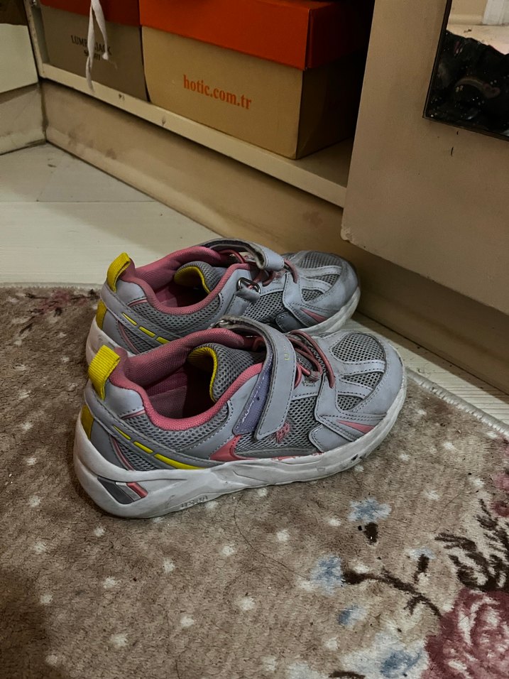 Gri bağcıksız, cırt cırtlı kız çocuk spor ayakkabısı, kauçuk tabanlı ve desenli, sokak stiline uygun.