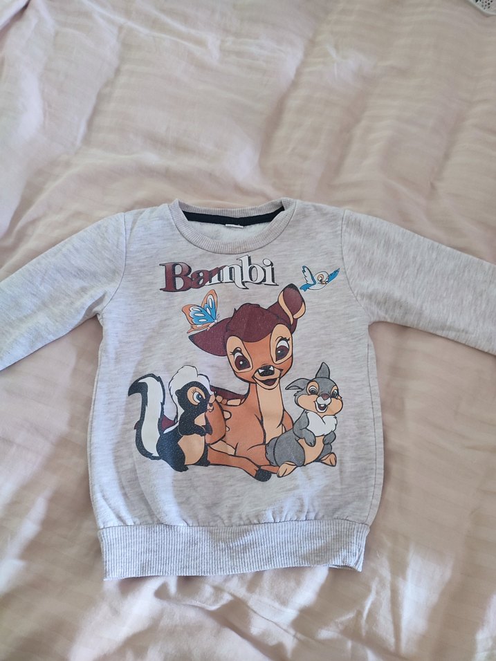 Pamuklu, örgü gri kumaştan, Bambi baskılı, uzun kollu, yuvarlak yaka ve bol kesim kız çocuk sweatshirtü. Rahat ve şık bir sokak stili parçası. 4 yaş yazıyor ancak kalıbı küçük 2-3 yaş