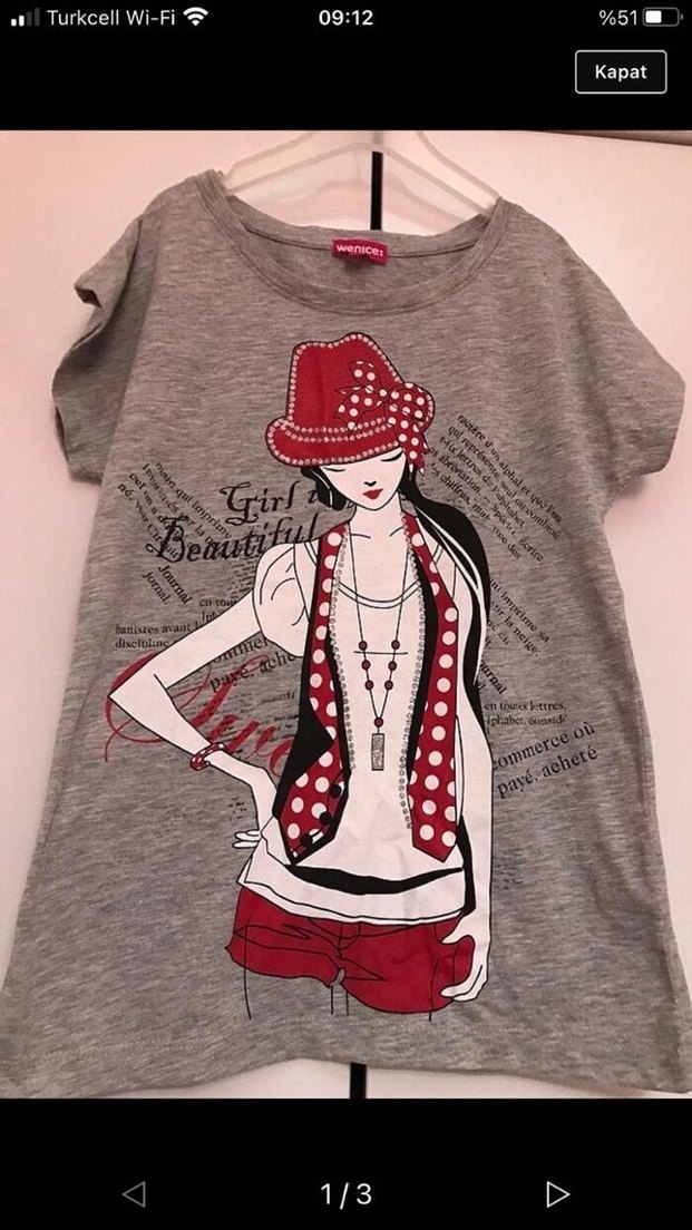 Pamuklu, gri renk, baskılı, düğmeli ve yuvarlak yakalı bol kesim kız çocuk tişörtü.