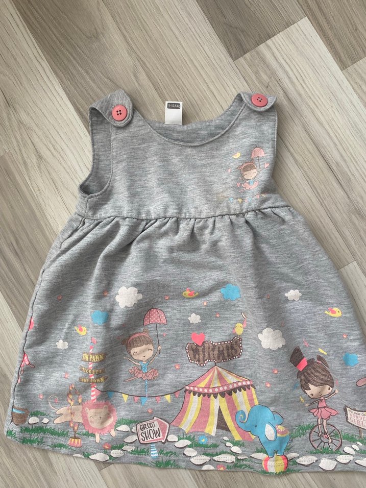 Kolsuz, gri baskılı, bol kesim ve yuvarlak yakalı kız çocuk elbisesi. Renkli baskılar ve fırfır detaylarıyla bohem tarzına uygun.