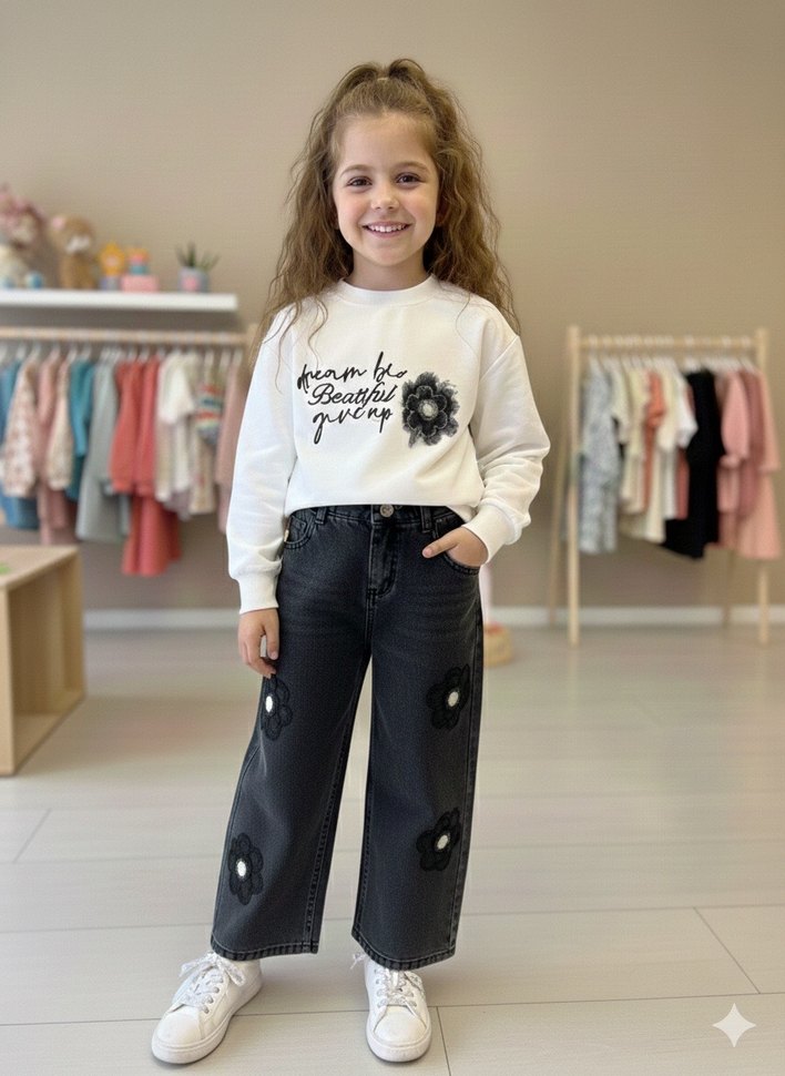 Gri baskılı ve kürk detaylı geniş paça kot pantolon, beyaz uzun kollu bisiklet yaka sweatshirt ile kombinlenmiş. Rahat sokak stili kız çocuk kıyafeti.