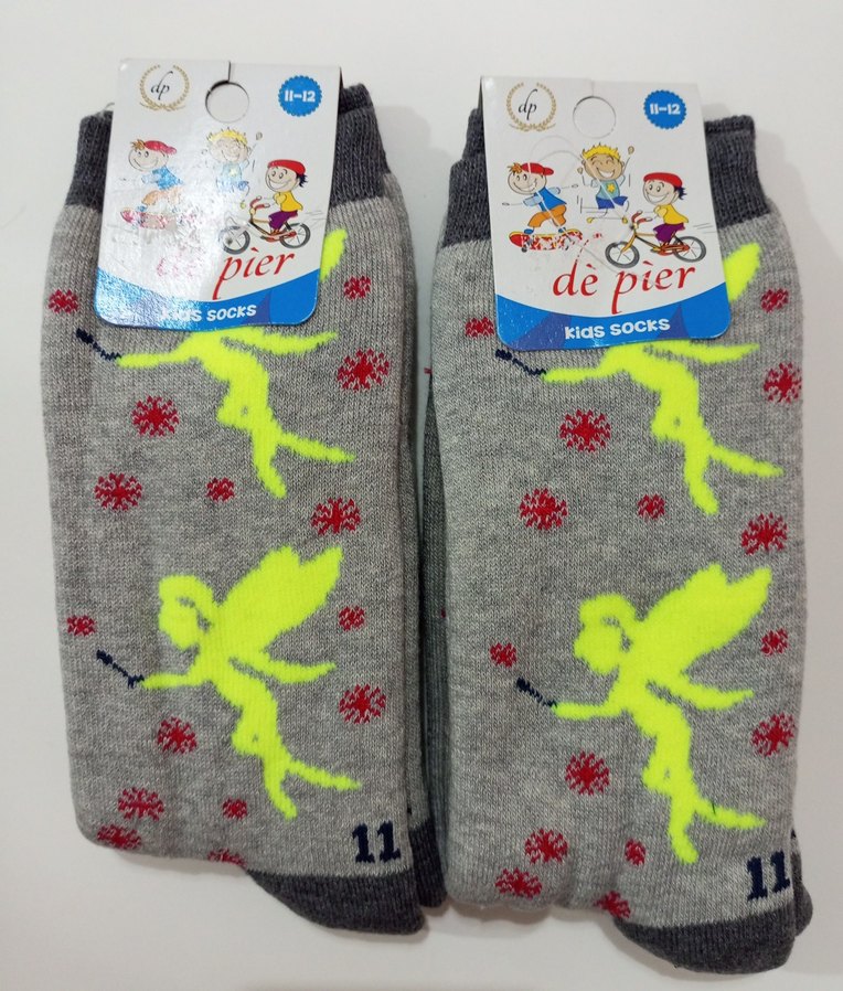 Kız çocukları için yumuşak ve sıcak kumaştan yapılmış havlu gri zemin üzerinde parlak sarı peri baskılı çoraplar. Rahat ve günlük kullanıma uygun. 11-12 yaş