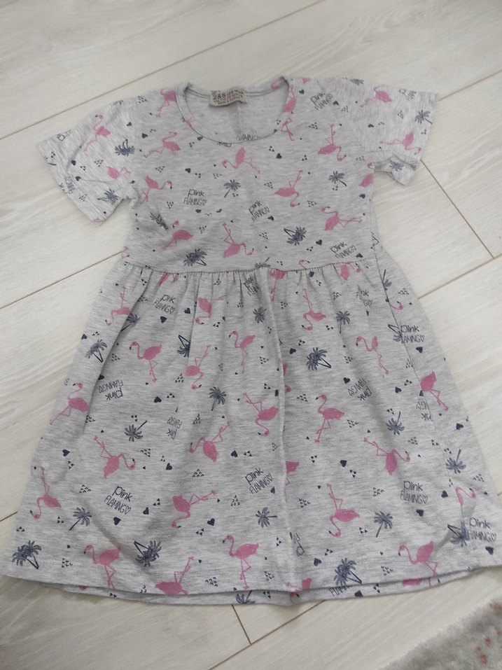 Gri renkli kız çocuk elbisesi, kısa kollu ve yuvarlak yakalıdır. Sentetik yumuşak kumaştan üretilmiş, pembe flamingo baskılı ve fırfır detaylıdır. Rahat kesimdir.