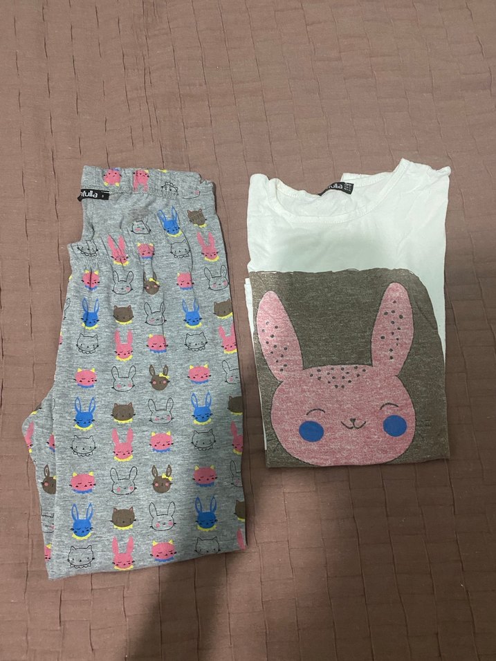 Kız çocukları için gri baskılı, örme dokulu kısa kollu pamuklu pijama takımı. Üst kısmı bisiklet yaka ve yumuşak kumaştan üretilmiştir. Alt bır kaç kez kullanıldı üstü çok kullandım