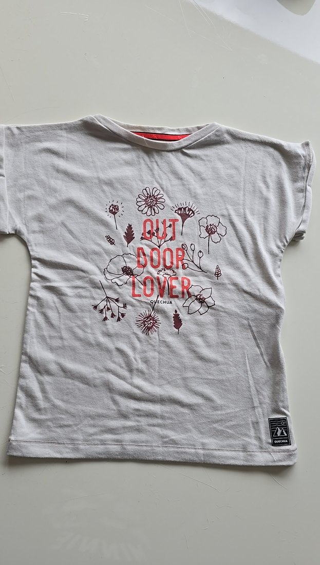 Gri renkli kız çocuk tişörtü, kısa kollu ve yuvarlak yakalıdır. Pamuklu kumaştan üretilmiş, bol kesim ve çiçek desenli "OUT DOOR LOVER" baskısına sahiptir.