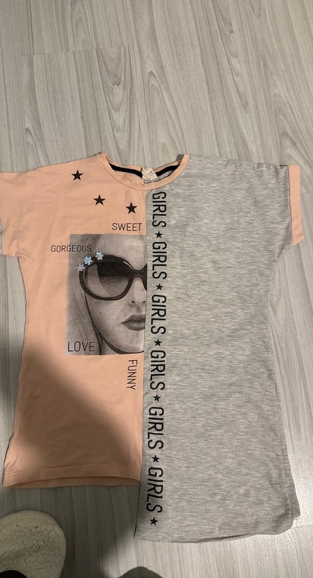 Pamuklu, gri renkli, baskılı, kısa kollu, bol kesim kız çocuk tişörtü