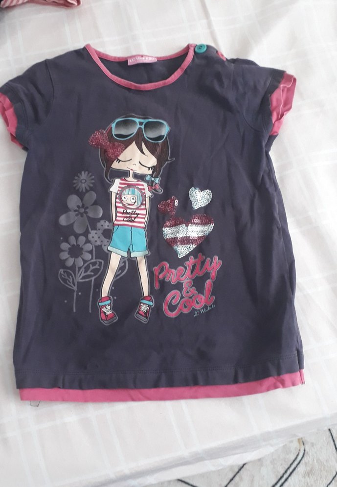 Kız çocukları için kısa kollu, yuvarlak yakalı ve bol kesim tişört. Yumuşak sentetik kumaştan üretilmiş, renkli baskılı tasarıma sahip.