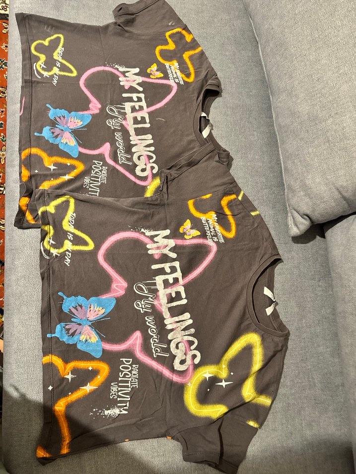 Gri renkli, bol kesim, yuvarlak yaka kız çocuk tişörtü. Renkli baskılı kelebek ve kalpler ile 'MY FEELINGS' yazısı bulunur. 8-9,10-11 yaşlrı mevcut