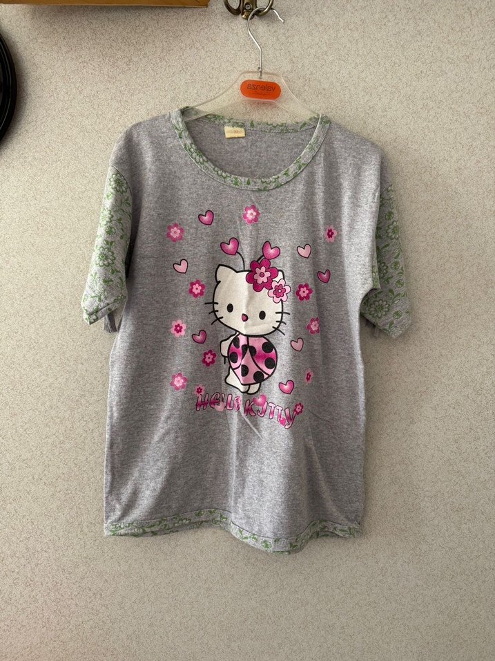 Pamuklu kumaştan yapılmış, kısa kollu ve bol kesim gri kız çocuk tişörtü. Pembe kalpler ve çiçeklerle baskılı, düğmeli detaylı.