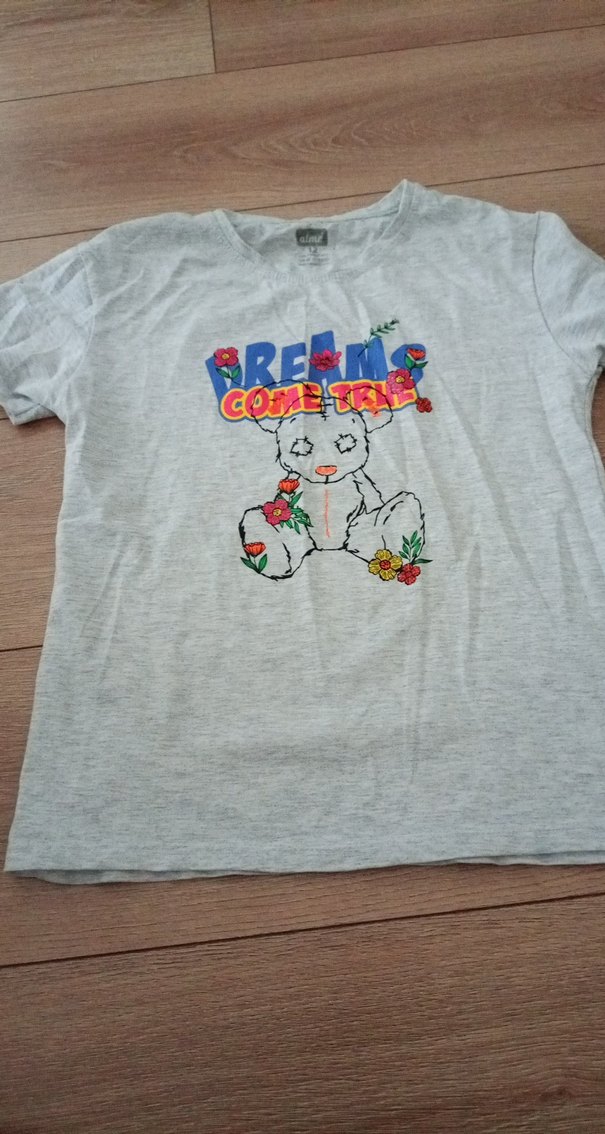 Pamuklu, gri renkli kız çocuk tişörtü, bol kesim ve yuvarlak yaka. Kısa kollu ve tavşan ile çiçek baskılı, bohem ve retro tarzda.