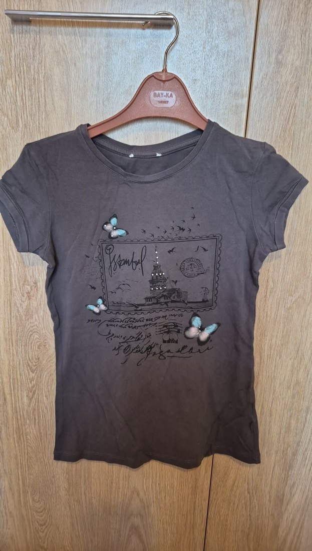 Yumuşak denim kumaştan, İstanbul temalı kelebek baskılı, kısa kollu, fitted kesim gri kız çocuk tişörtü.