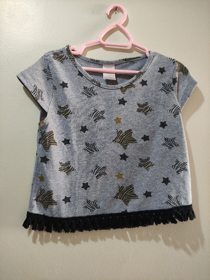Gri renkli, kısa kollu, yuvarlak yakalı kız çocuk tişörtü. Yıldız baskılı ve alt kısmı fırfırlı, rahat kesim, sentetik kumaştan üretilmiştir. ⭐